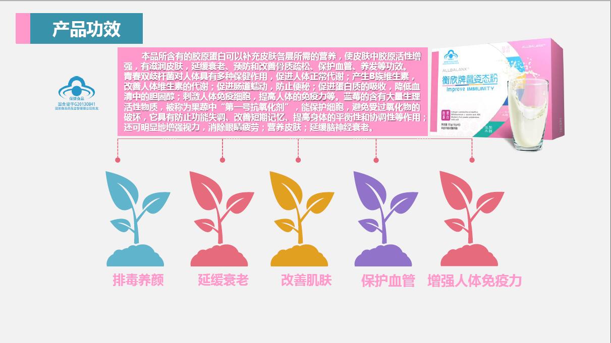 我們的膠原蛋白呢,同樣也是屬于國(guó)食健字號(hào)的。它所含的膠原蛋白呢,可以補(bǔ)充皮膚各層所需的營(yíng)養(yǎng),使皮膚中的膠原活性增強(qiáng),有滋潤(rùn)皮膚,延緩衰老,預(yù)防和改善骨質(zhì)疏松,能夠保護(hù)血管養(yǎng)發(fā)等很多的功效。
